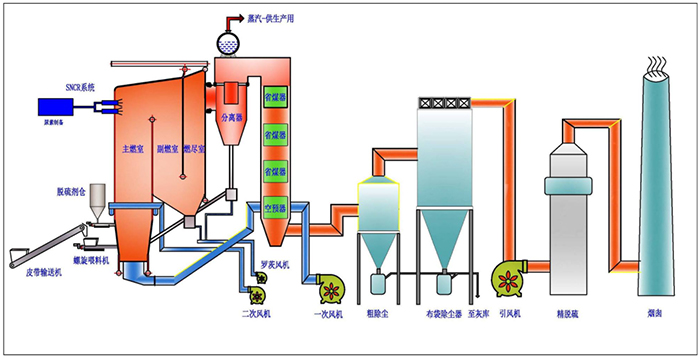 在循環流化床鍋爐的運行中,含有燃料灰的固體床材料。石灰石及其反應產物在爐旋風分離器、回流器、爐的封閉回路中處于連續高速循環中,在爐內進行高效燃燒和脫硫反應。除了床材料在這個回路中的外部循環外,床材料在重力作用下沿著爐的四個壁不斷進行內部循環。
