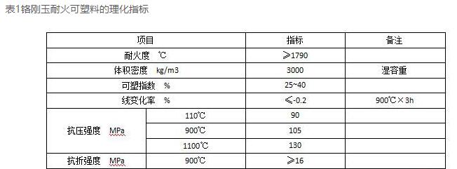 眾所周知,鉻剛玉是一種耐火原料,主要由氧化鉻和剛玉組成。鉻剛玉具有高熔點和硬度,在高溫下體積穩定,不膨脹收縮,能很好地抵抗酸性和堿性氣體的侵蝕,不易與爐渣發生反應。以鉻剛玉為基料生產的鉻剛玉耐火性高,耐磨性好,在高溫下耐酸堿侵蝕,可延緩襯里損壞,延長使用壽命。表1是鉻剛玉耐火塑料的物理化學指標。
